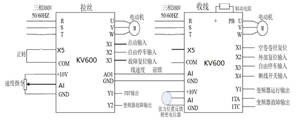 通過(guò)控制主拉絲機(jī)的頻率來(lái)決定線速度的大小, 收線同步線速度由主機(jī) AO1輸出,收線變頻器
