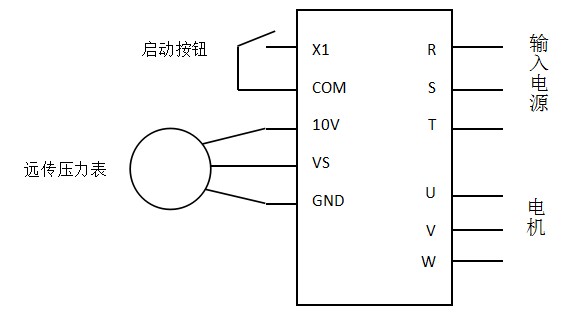 恒壓供水主要由一個(gè)電機(jī),一個(gè)水泵,一個(gè)緩沖罐,一個(gè)遠(yuǎn)傳壓力表,一個(gè) KV600 變頻器組成。一般使用端子啟停。恒壓供水系統(tǒng)通過遠(yuǎn)傳壓力表反饋信號(hào)與給定值進(jìn)行比較,當(dāng)反饋值高于睡眠閥值時(shí),進(jìn)過休眠時(shí)間后,變頻器進(jìn)入休眠狀態(tài)。當(dāng)反饋的閥值低于啟動(dòng)閥值的時(shí)候,電機(jī)重新啟動(dòng)。使壓力保持在給定值的附近。